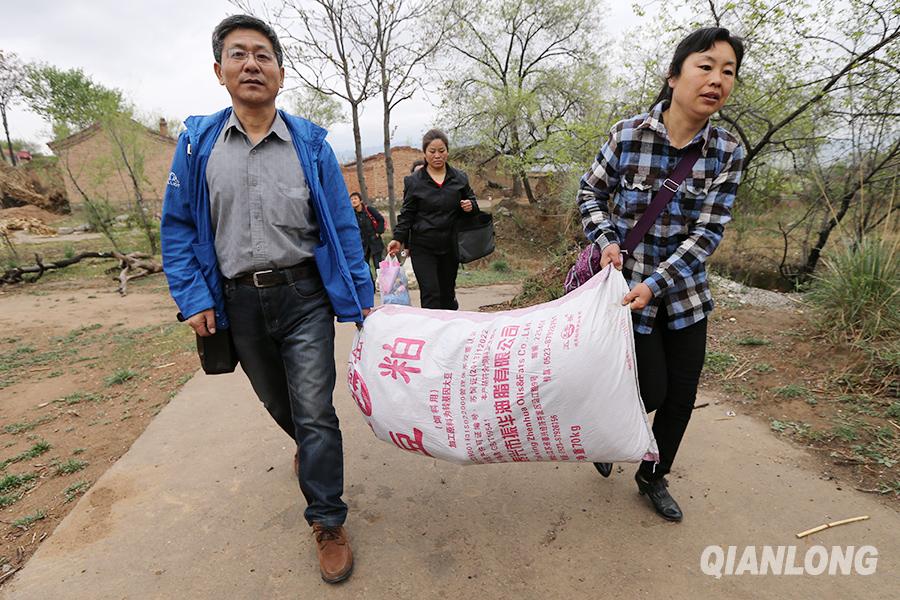 5月1日,著名儿童心理专家、北京慈铭轩心理咨询中心主任周振基(左)给灵丘县贫困家庭送急需的生活物资。千龙网发