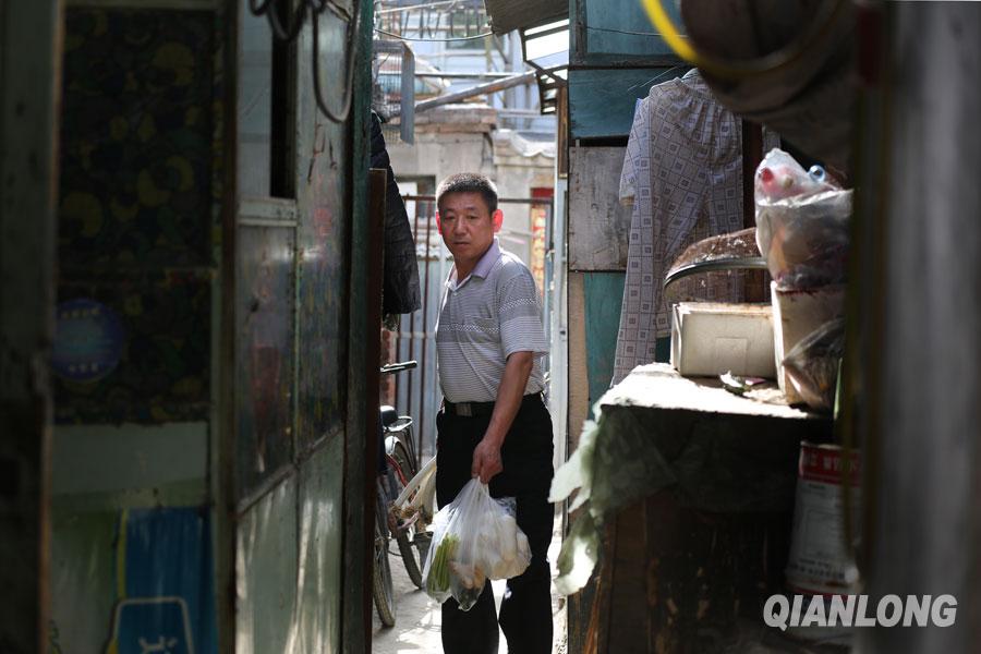 王福生的家住在排子房胡同的最里面,拎着东西出入时需要侧身才能通行(5月5日摄)。千龙网记者 陈康摄