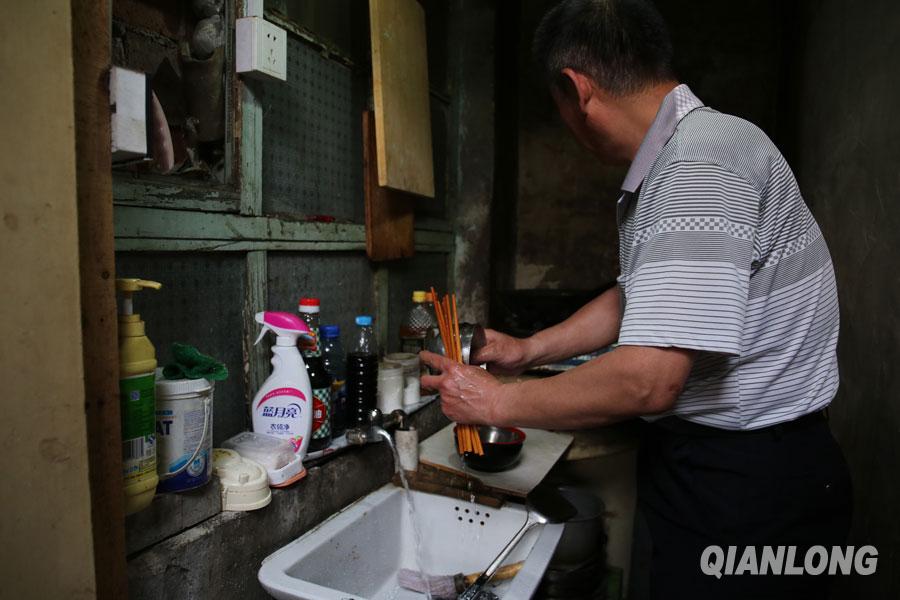 在无法转身的厨房里,餐具与厨具钉在墙上、挂在灶台旁(5月5日摄)。千龙网记者 陈康摄