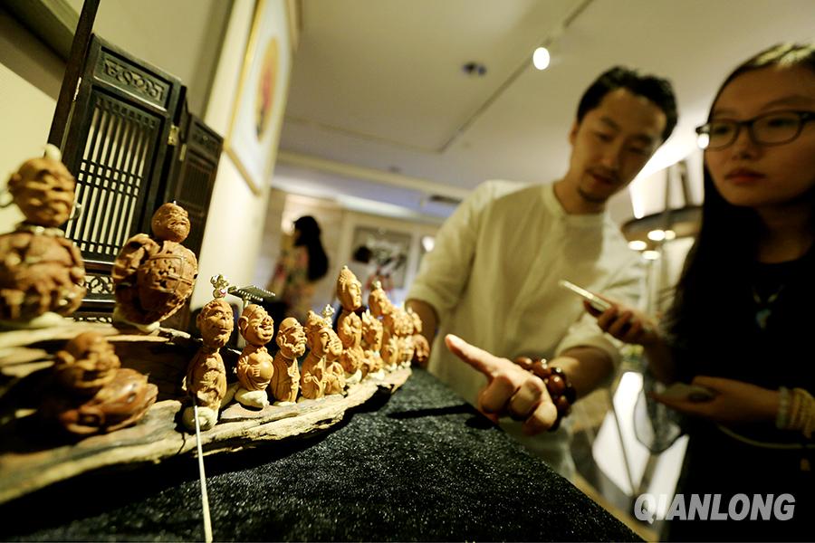 5月25日,核雕艺术家向观众讲述自己作品的创作过程。千龙网记者王悦摄