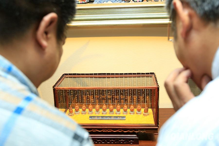 5月25日,两位参观者正在欣赏核雕作品。千龙网记者王悦摄