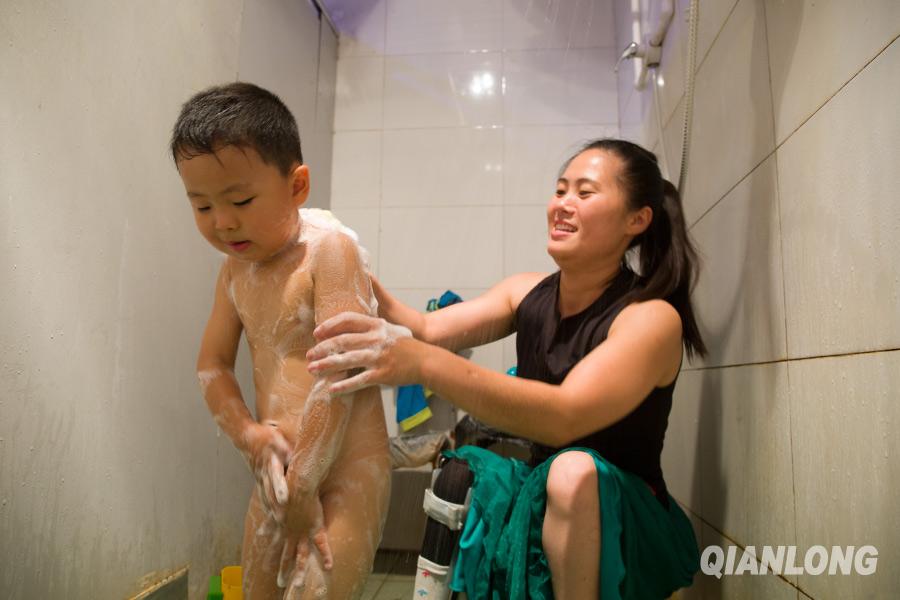 陈孟静每天先给儿子洗澡,然后让他自己看一会电视,等自己洗完澡,两人一起休息(7月9日摄)。千龙网记者 于颖摄