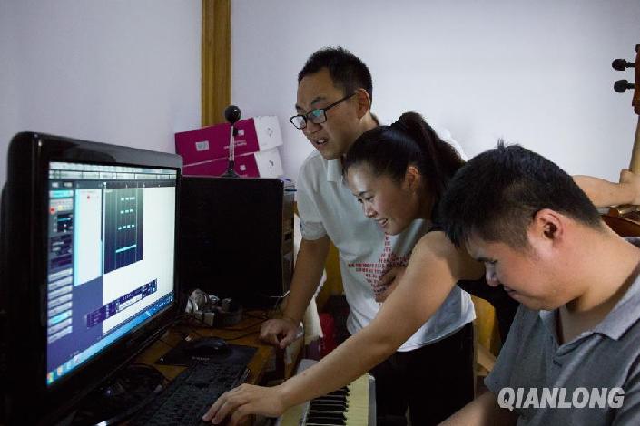 陈孟静的丈夫仲辉乐视力不好,但非常聪明,他现在正在自学编曲。7月9日,陈孟静要为自己的大提琴曲录一段伴奏,仲辉乐在一旁教她使用录音软件。千龙网记者于颖摄