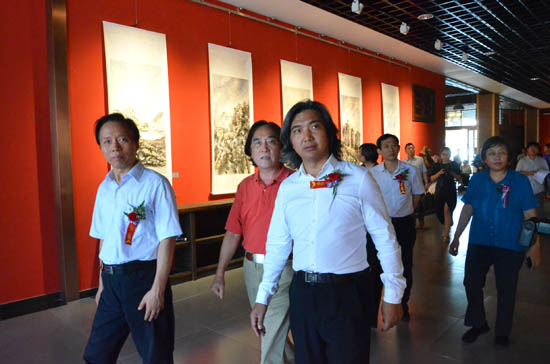 文化部原副部长、中国艺术研究院院长王文章(左)在中国美术馆馆长、中国美术家协会副主席吴为山(右)等人的陪同下参观王鑫生“共筑长城呼唤和平”纪念抗战胜利70周年画展。张静/摄