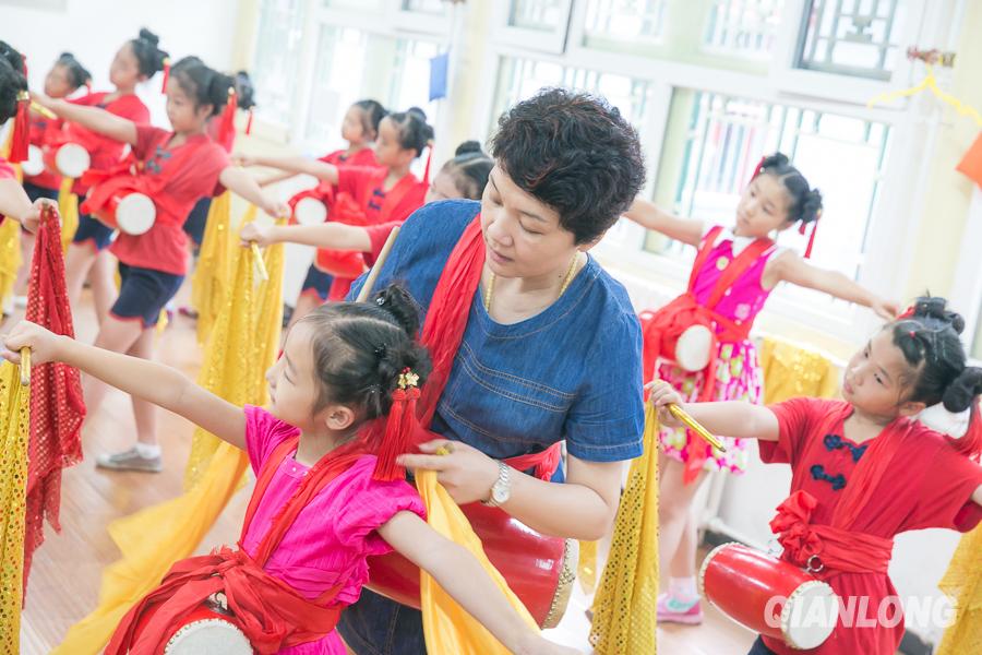 7月9日,老师在指导金台书院小学校腰鼓队排练。千龙网实习记者宋鹏飞摄