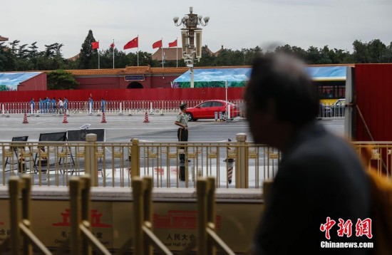 9月1日,北京天安门广场阅兵进入倒计时,广场和城楼都禁止游客进入,图为一名武警守卫在长安街上。中新社发 张浩 摄