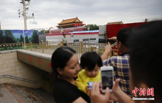 9月1日,北京天安门广场阅兵进入倒计时,广场和城楼都禁止游客进入,图为游客在外围拍照。中新社发 张浩 摄
