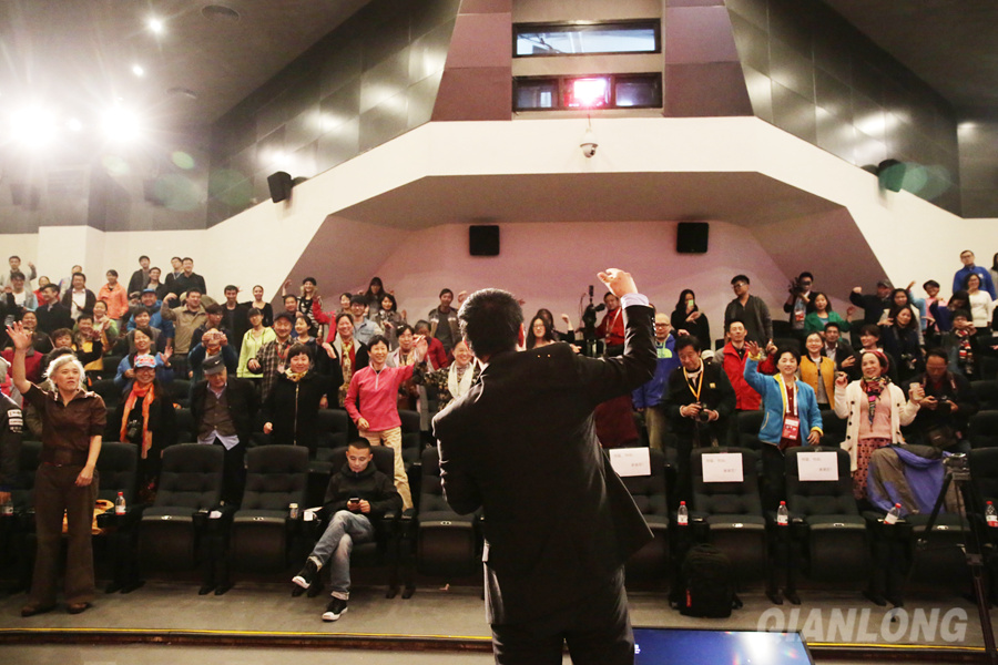 10月28日,《大时代下的摄影记录》主题摄影讲座在中华世纪坛举办。图为讲座开始前,脱口秀演员宋启瑜带领大家做起了“热身运动”。千龙网记者王璟玥摄