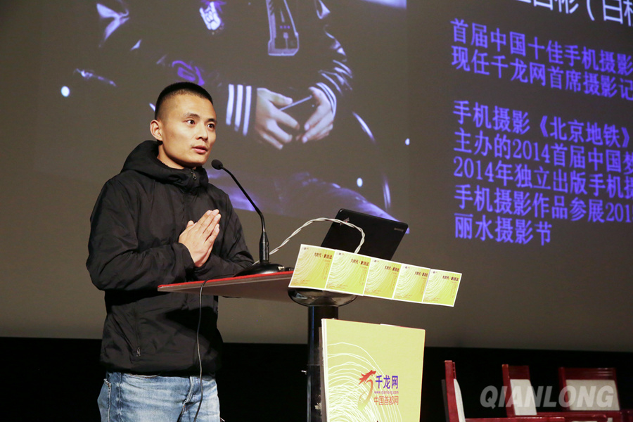 10月28日,《大时代下的摄影记录》主题摄影讲座在中华世纪坛举办。图为千龙网首席摄影记者王自彬分享手机摄影的拍摄技巧。千龙网记者王璟玥摄