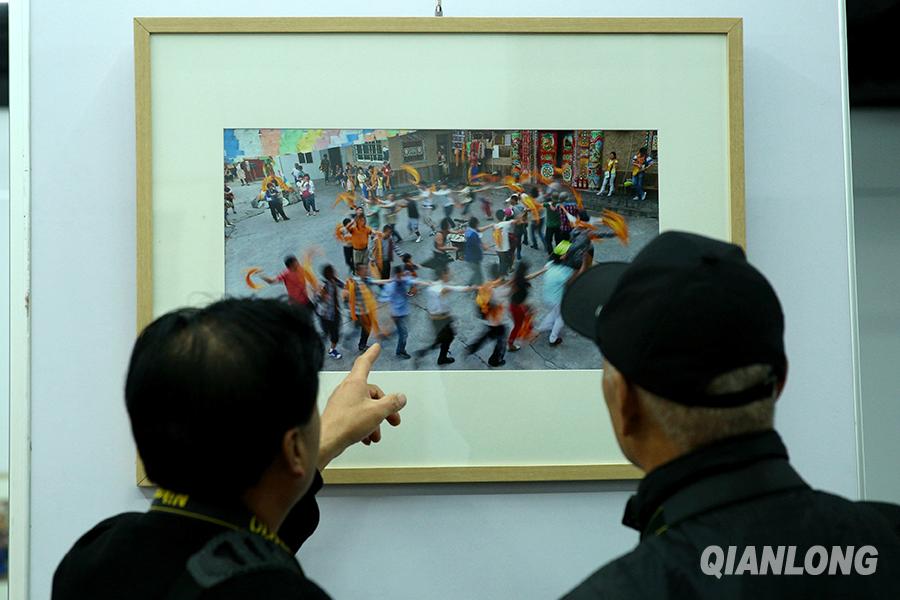 11月17日,“我们从新区走来-北京大兴摄影名家作品展”在北京举办。图为展览现场,影友们聚在一起谈论摄影技巧。千龙网记者王悦摄