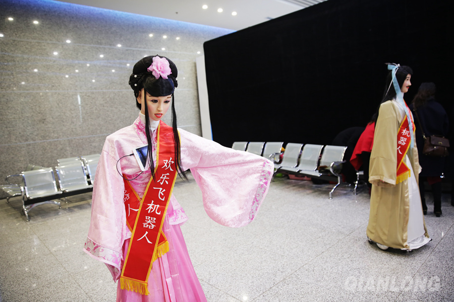 11月18日,2015中国设计节在北京大兴区拉开帷幕。图为展厅内的飞机机器人“承担”了展会接待的任务。千龙网记者 王璟玥摄
