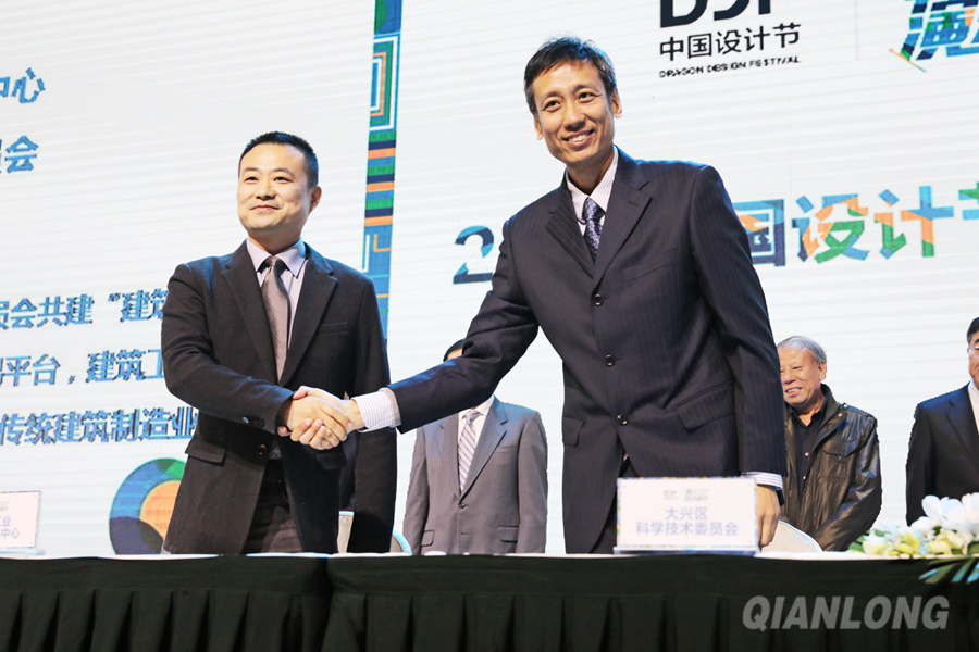 11月18日,2015中国设计节在北京大兴区拉开帷幕。图为北京工业设计促进中心代表(左)与大兴区科学技术委员会代表(右)签署“建筑工业设计大厦”战略合作协议。千龙网记者王璟玥摄