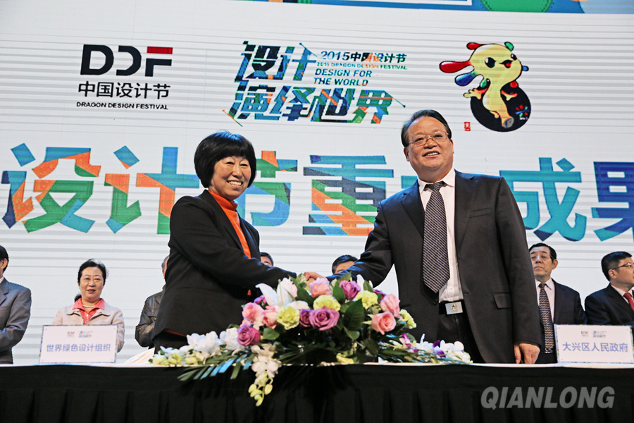 11月18日,2015中国设计节在北京大兴区拉开帷幕。图为世界绿色设计组织代表(左)与北京市大兴区人民政府代表(右)共同签署协议,将面向设计行业及绿色设计产业,在设计创新基地建设、国际设计交流及人才培养上开展全面合作。千龙网记者王璟玥摄