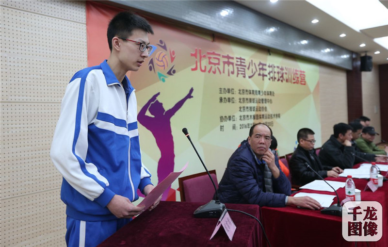 首期北京市青少年排球训练营(冬季)2月16日在木樨园体校开营。参加训练营的同学在开营仪式上发言(2月16日摄)。