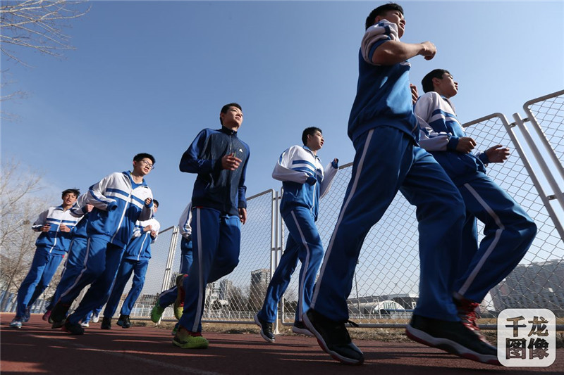 首期北京市青少年排球训练营(冬季)2月16日在木樨园体校开营。参加训练营的同学在田径训练场热身(2月17日摄)。