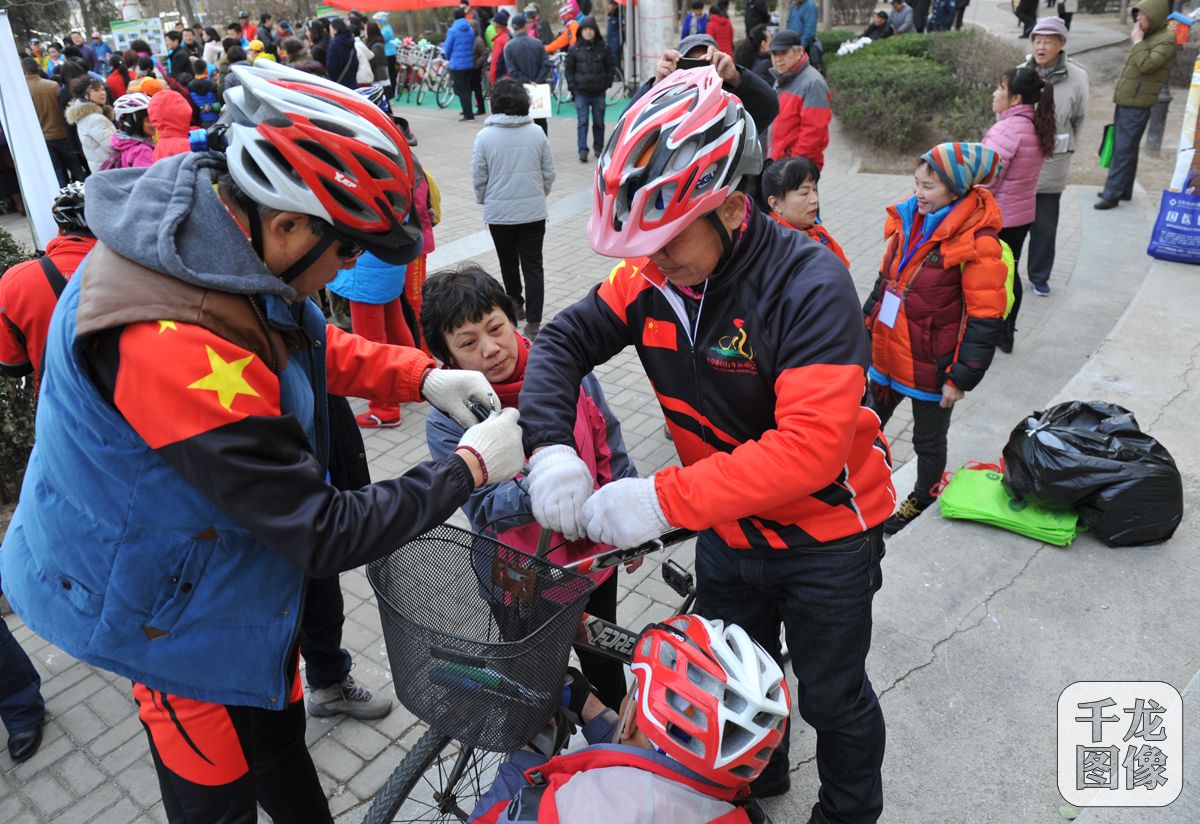 志愿者为北京市民义务修车倡导绿色出行