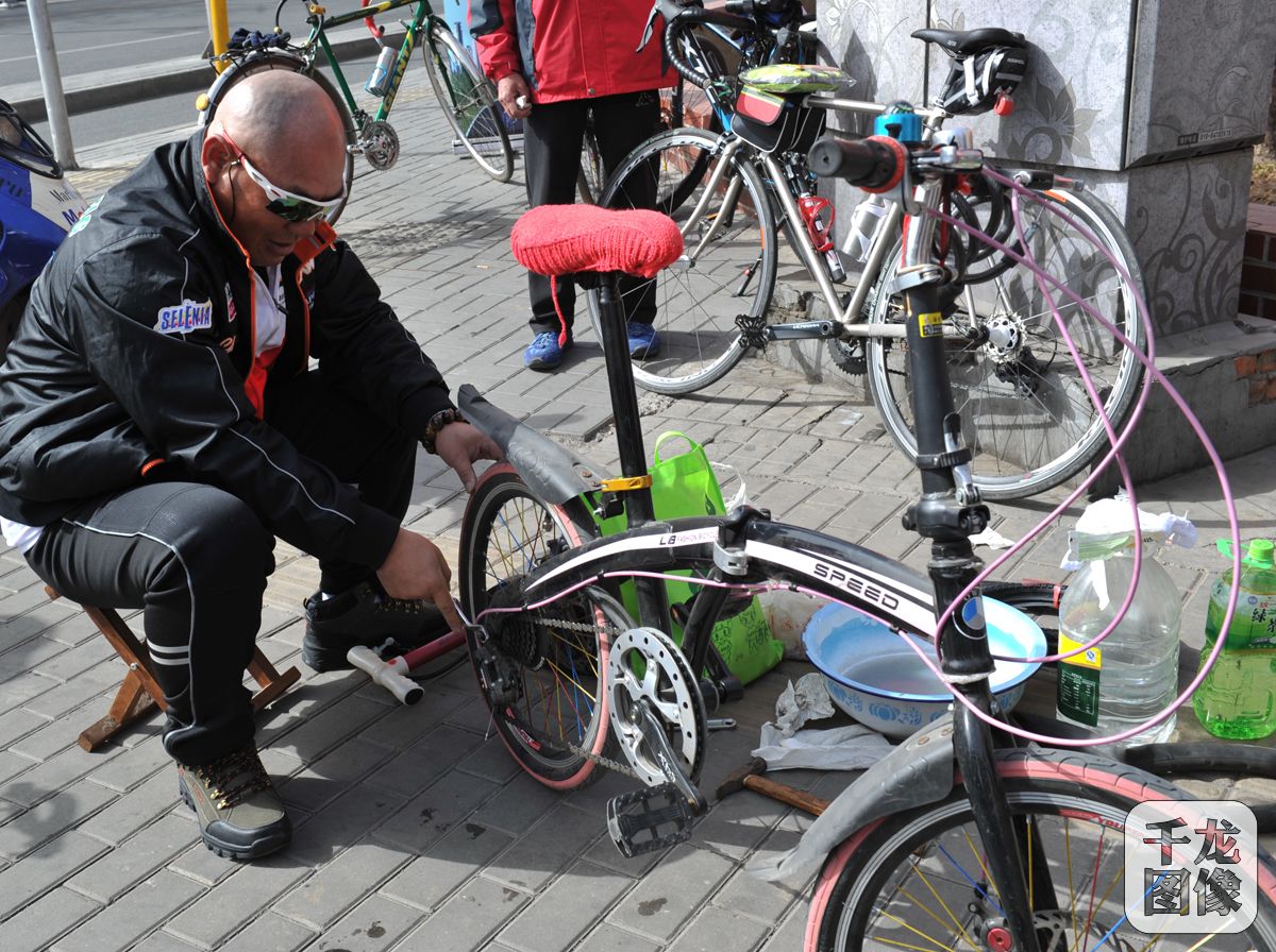 志愿者为北京市民义务修车倡导绿色出行