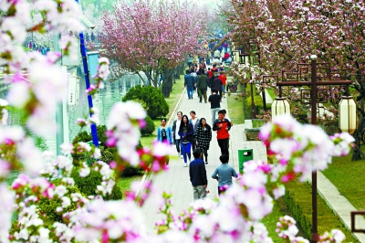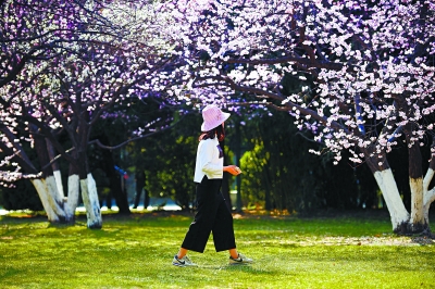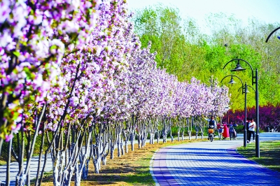 市民在元大都遗址公园漫步。进入盛花期的数千株西府、垂丝海棠在河岸两侧绵延成壮观的花海,令人流连忘返。由于近期京城气温持续偏高,“海棠花溪”较往年提前一周进入最佳观赏期。