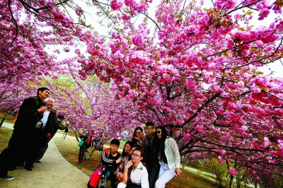 游客在玉渊潭公园观赏刚刚绽放的晚樱。目前公园种植的关山、一叶等15种晚樱已陆续盛开,花团锦簇,蔚为壮观。由于气温持续走高,花期比往年提前了近一周时间。