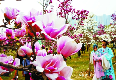 昆曲演员在北京国际雕塑公园玉兰花下表演。近日,北京国际雕塑公园举办的“玉兰茶会”,巧妙融合时尚气息,将琴棋、书画、礼乐、茶席、戏曲、养生、服饰、诗会等多个类别汇聚,为这座北京规模最大的玉兰观赏园增添了古典与优雅的韵味。