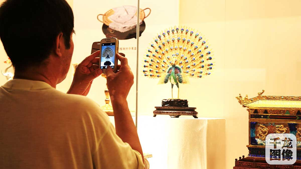 8月9日,《匠心筑梦烁古今—燕京八绝》在首都博物馆展出。图为参观者用手机拍摄景泰蓝工艺制品(8月12日摄)。千龙网实习记者许珠珠摄