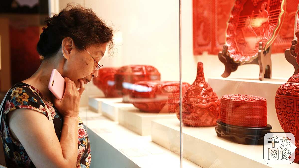 8月9日,《匠心筑梦烁古今—燕京八绝》在首都博物馆展出。图为参观者欣赏雕漆作品(8月12日摄)。千龙网实习记者 许珠珠摄