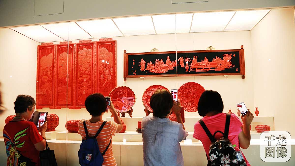 8月9日,《匠心筑梦烁古今—燕京八绝》在首都博物馆展出。图为众多参观者用手机拍摄雕漆作品(8月12日摄)。千龙网实习记者许珠珠摄