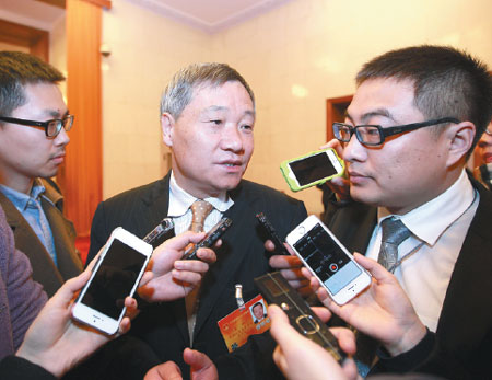 Xiao Gang (center),chairman of the China Securities Regulatory Commission,speaks with reporters after a meeting at the ongoing annual session of the National People's Congress. Xiao said the commission will push "step by step" for a registration-based reform of the initial public offering system. [China Daily] |