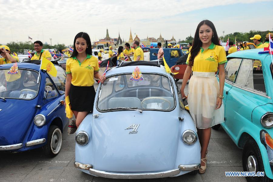 People pose for photos with antique cars during a parade as part of the celebration of Thai King's 87th Birthday Anniversary in front of Grand Palace in Bangkok, Thailand, Dec. 4, 2014. Thai King Bhumibol Adulyadej will celebrate his 87th birthday on Dec. 5. [Xinhua] |