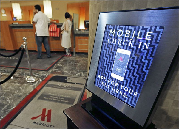 A mobile check-in option is offered for travelers at the main check-in counter at the Marriott Marquis Times Square hotel. [File photo]
