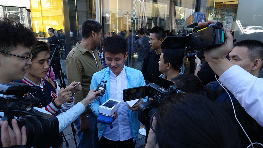 The first customer is excited outside the Apple store after picking up his new iPhone in Beijing, on Sept 25, 2015. [Photo by Liu Zheng/chinadaily.com.cn]