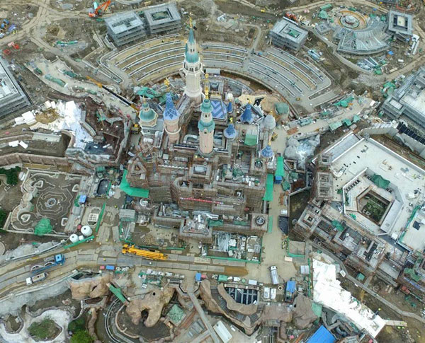 An aerial view of Shanghai Disney Resort taken on Thursday shows construction work in progress at the resort, especially the iconic building -- Enchanted Storybook Castle. The castle will be the tallest and largest castle ever built at a Disney theme park. The first Disney resort in China's mainland has been under construction for four and a half years, and is expected to open in spring next year. |