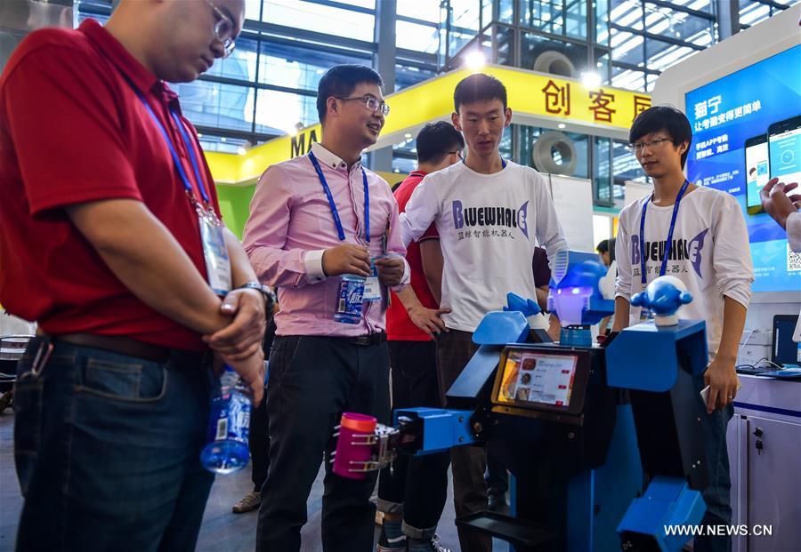 Exhibitors introduce a smart robot that can serve food during the 17th China Hi-tech Fair in Shenzhen, south China's Guangdong Province, Nov. 16, 2015. [Xinhua]