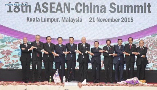 Chinese Premier Li Keqiang (5th L) poses for a group photo with ASEAN members' leaders during the 18th ASEAN-China summit in Kuala Lumpur, Malaysia, Nov. 21, 2015. [Xinhua] |