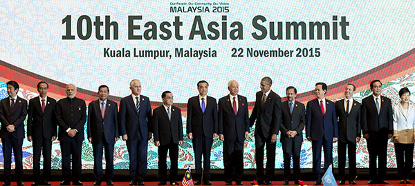 Premier Li Keqiang (center left) and other participating leaders take part in a family photo during the East Asia Summit at the Kuala Lumpur Convention Centre in Kuala Lumpur on Sunday. [Photo / China Daily] |