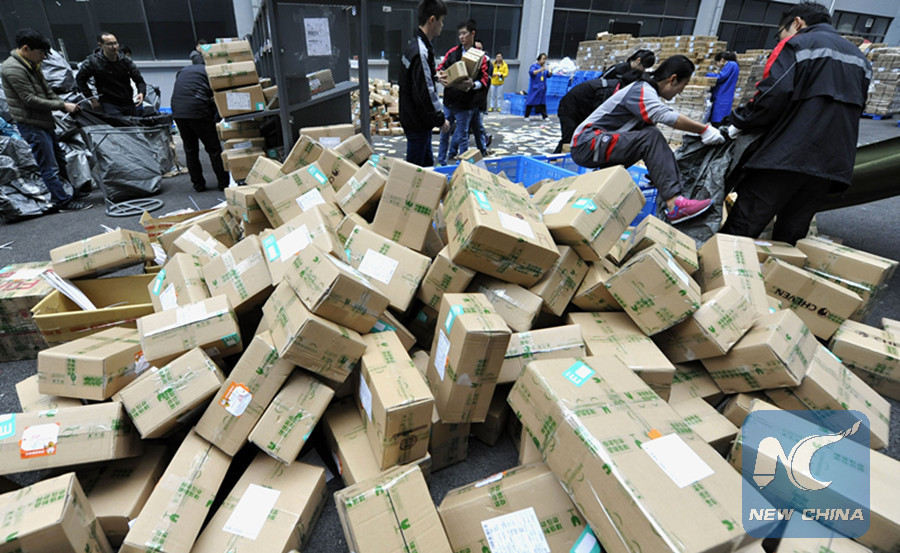 Workers work at a sorting center of an express company in Hefei, capital of east China's Anhui Province, on Nov. 11, 2014. [Xinhua] |