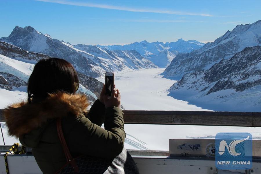 A Chinese tourist takes photos of the Aletsch Glacier at the foot of the Jungfrau on Jan. 23, 2016. [Xinhua] |