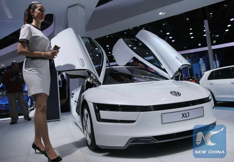 A staff member of the auto show walks by a vehicle of Volkswagen during the Auto Shanghai 2015, east China's Shanghai, April 20, 2015. [Xinhua] |