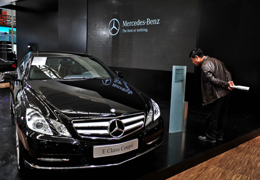 A visitor views a Mercedes-Benz E260 car at the 2013 China International Automobile Industry Exhibition in Tianjin, northern China, April 27, 2013. [Xinhua] |