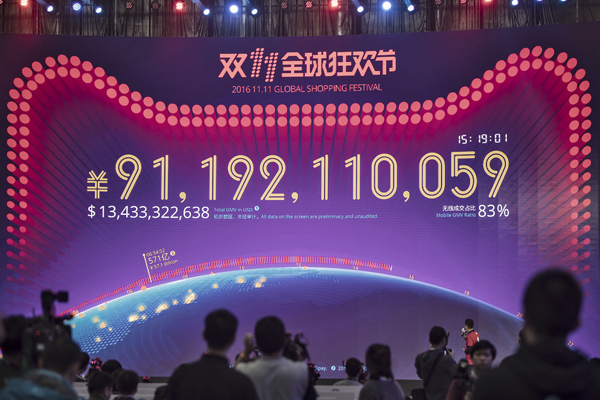 Attendees watch a monitor displaying live updates of sales figures during Alibaba's annual Singles Day event in Shenzhen. [Photo/Agencies] |