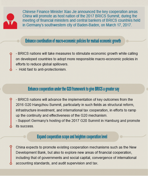 Wang also announced that the 2017 BRICS Summit will be held in September in Xiamen, Fujian Province. As the host country, China will call on all its partners to work together to create a "Stronger Partnership for a Brighter Future" – the slogan for this year's summit – and to welcome a second decade of cooperation in the light of past experience and a vision of future development.