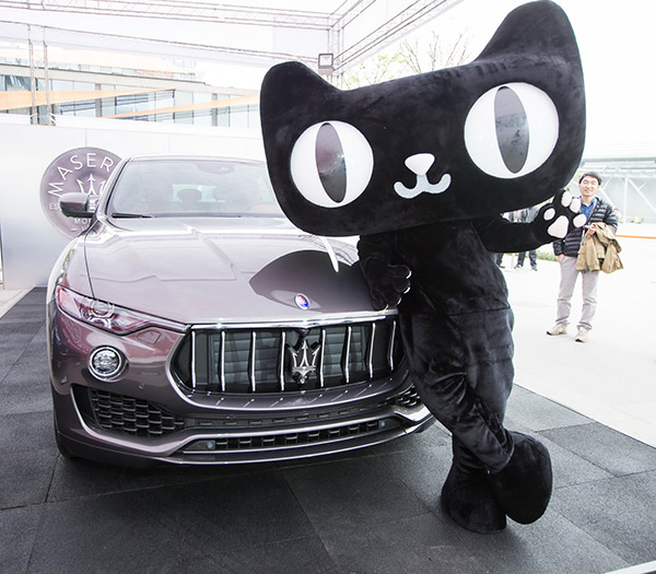 A Tmall mascot poses with a Maserati SUV Levante 350HP in Hangzhou, Zhejiang province, after the luxury carmaker sold its first 100 models on the Alibaba online platform. Starting at 999,800 yuan, Maserati sold all 100 cars in 15 minutes last year. [Xu Kangping/for China Daily] |