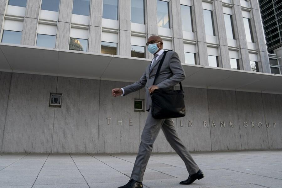 A pedestrian walks past the World Bank headquarters in Washington, D.C., the United States, April 20, 2022. [Photo/Xinhua]