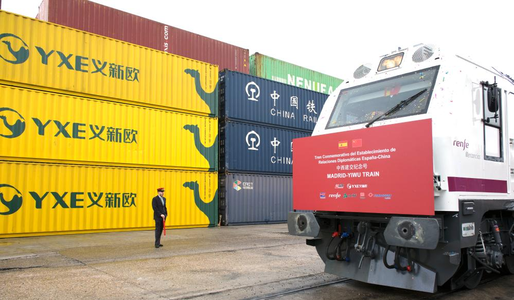 A China-Europe freight train heading for Yiwu of China departs from Madrid, Spain, March 9, 2023. [Photo/Xinhua]