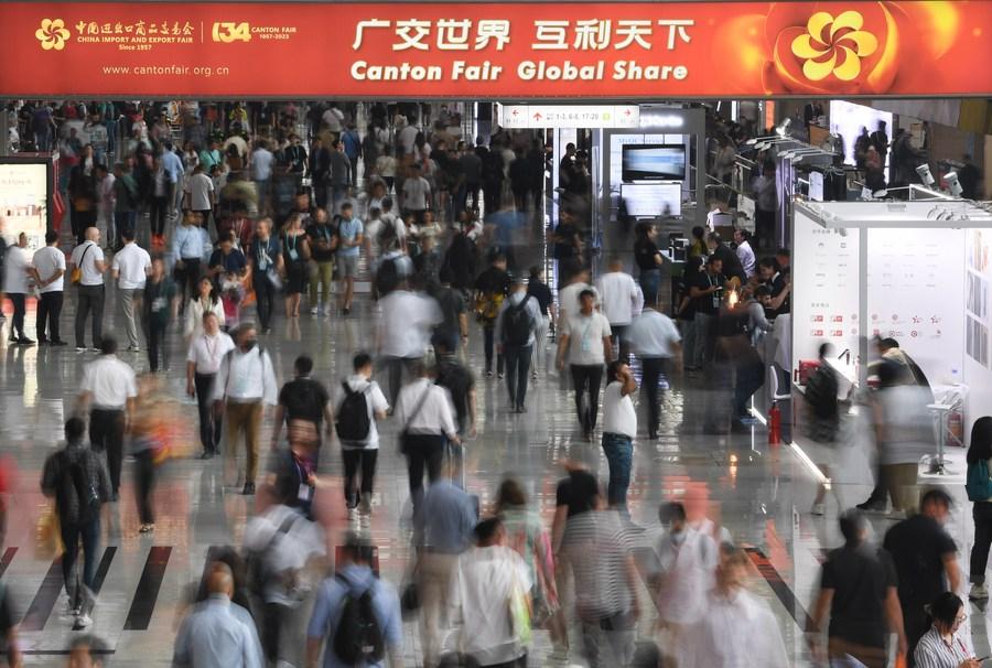 Participators are seen at the 134th session of the China Import and Export Fair in Guangzhou, south China's Guangdong Province, Oct. 15, 2023.(Xinhua/Lu Hanxin)
