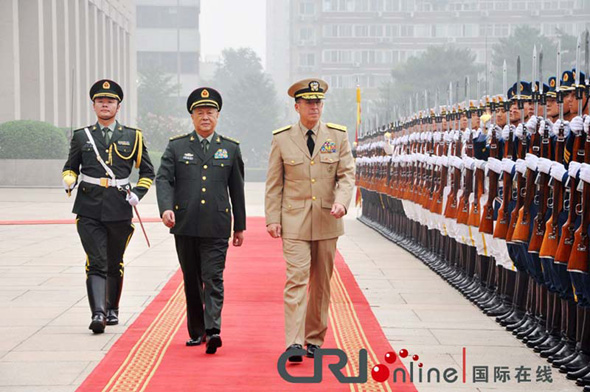 Chen Bingde, chief of the General Staff of the Chinese People's Liberation Army (PLA), welcomes Mike Mullen, chairman of the U.S. Joint Chiefs of Staff in Beijing on July 11, 2011. |