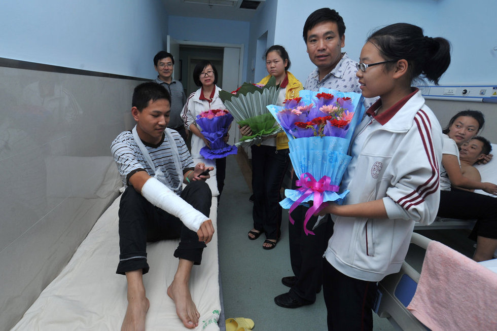 Two were killed and another 13 injured after a bus carrying 34 senior high school students and a teacher crashed into a tree and overturned in central China's Hubei province.