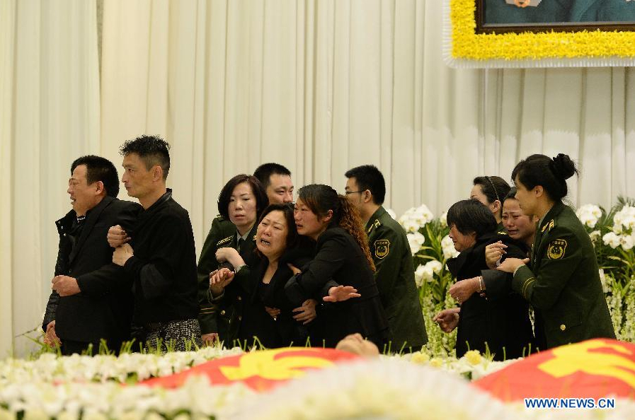 | Relatives wail as they mourn for Qian Lingyun and Liu Jie, two young Chinese firefighters who fell to their death during a blaze in a highrise building, at a memorial meeting in Shanghai, east China, May 5, 2014. [photo / Xinhua] |