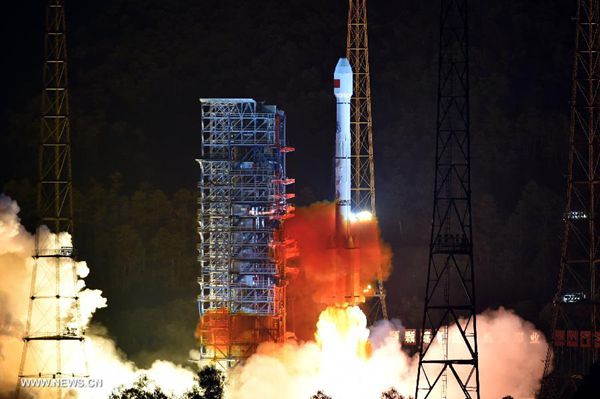 A Long March-3B/Yuanzheng-1 rocket carrying two new-generation satellites for the BeiDou Navigation Satellite System (BDS) blasts off from the Xichang Satellite Launch Center in the southwest China's Sichuan Province, July 25, 2015. China successfully launched two satellites for its indigenous global navigation and positioning network at 8:29 p.m. Beijing Time Saturday, the launch center said. [Xinhua/Zhu Zheng] |