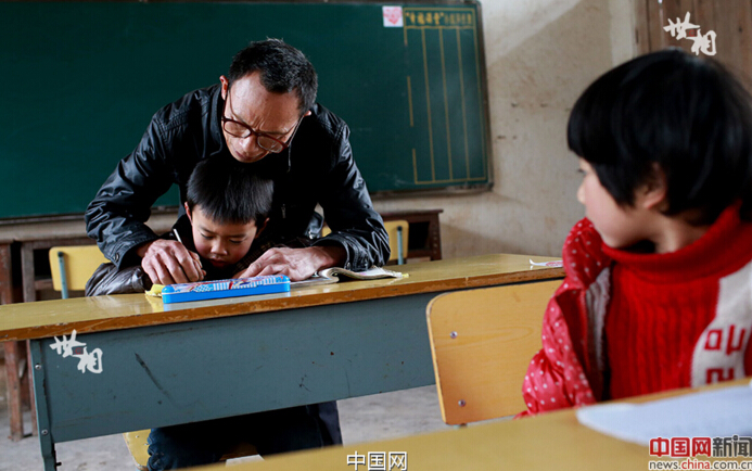 Li Zuqing, 60, teaches one of his students to write at a school in a remote mountainous area in Guilin, Guangxi Zhuang Autonomous Region. Li lost his right leg due to a poisonous snake bite and is fitted with an artificial limb. [Photo/China.org.cn] |